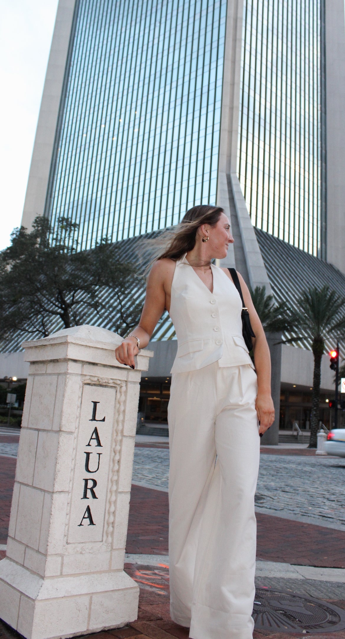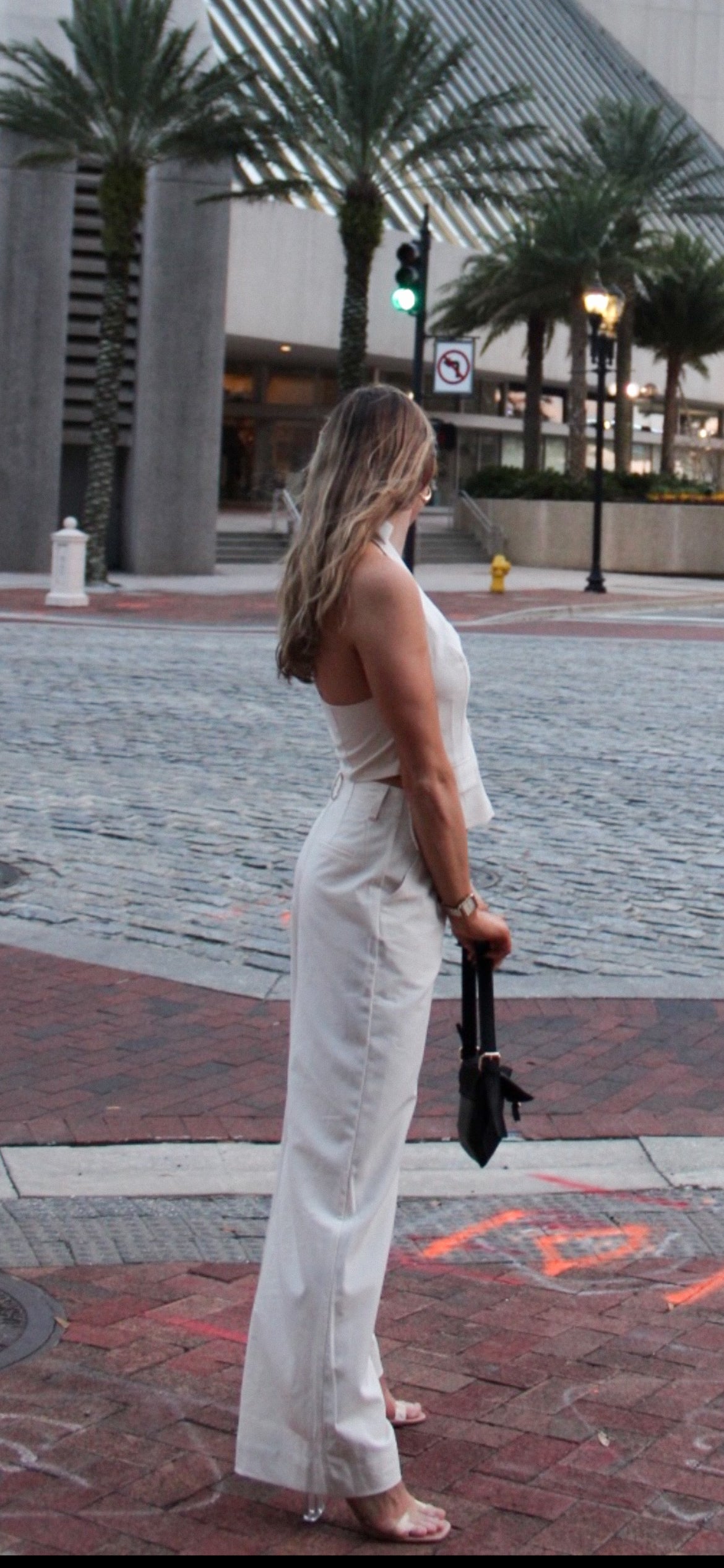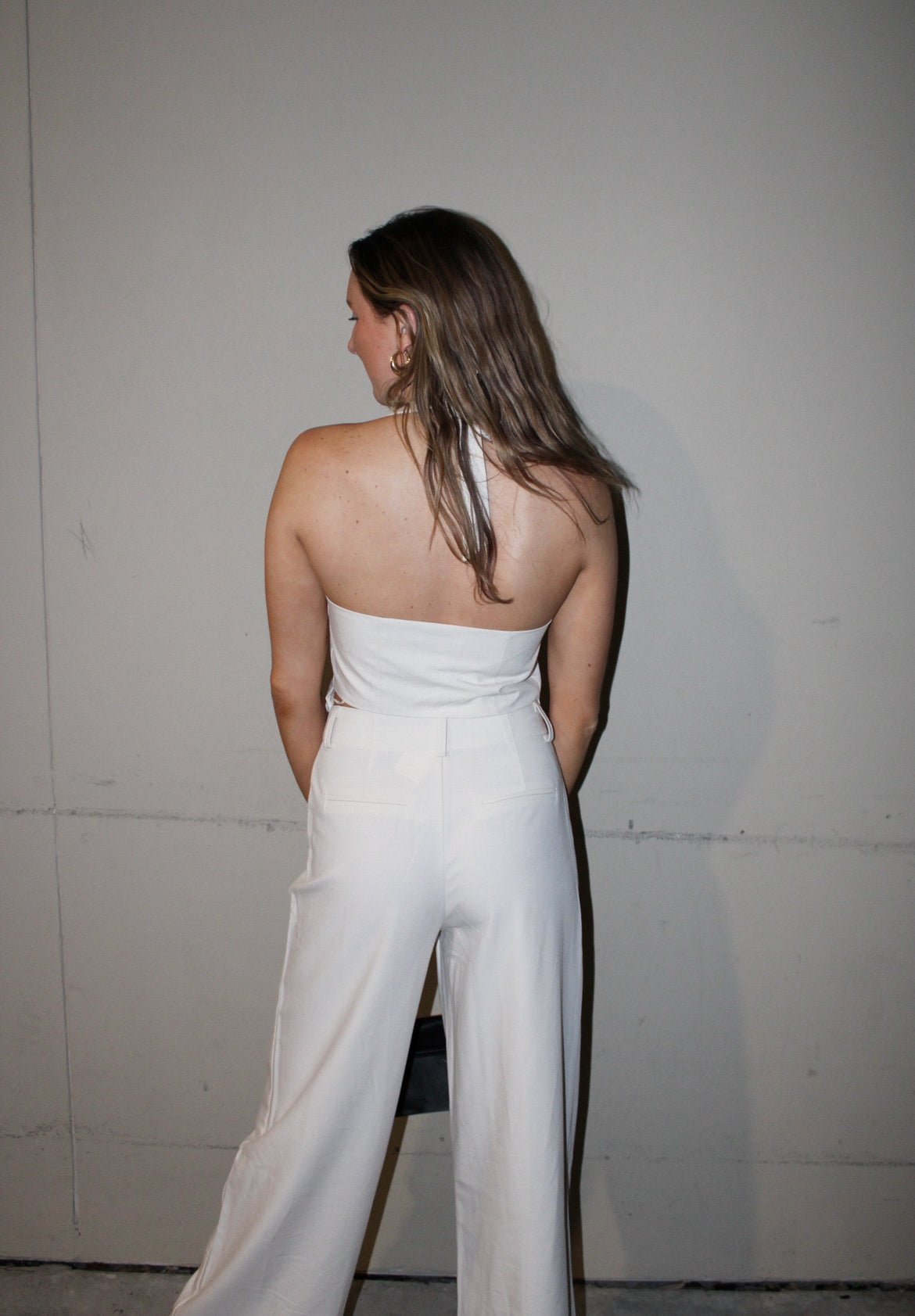 This off-white/cream halter tie neck tank is for those who want a chic look. Classy yet edgy, turning heads wherever you go! Elevate your wardrobe with this top that screams confidence, perfect for owning the scene at any stylish event or night out.